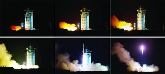 2016年8月16日1时40分,我国在酒泉卫星发射中心用长征二号丁运载火箭成功将世界首颗量子科学实验卫星(简称“量子卫星”)发射升空(拼版照片)。 □新华社记者/金立旺 摄