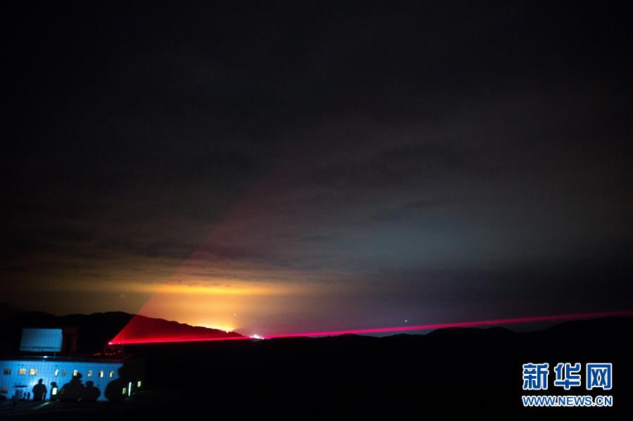 兴隆量子通信地面站望远镜发射出红色信标光(2016年11月25日摄)