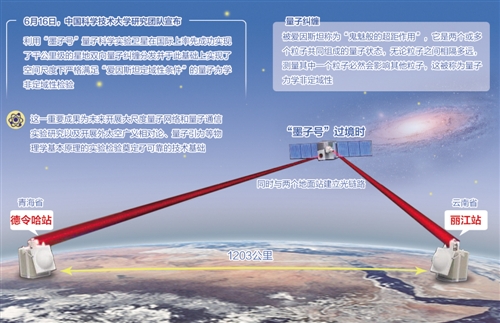 在此基础上,潘建伟团队于2005年在国际上首次实现了水平距离13公里(大于大气层垂直厚度)的自由空间双向量子纠缠分发。2010年,又在国际上首次实现了基于量子纠缠分发的16公里量子态隐形传输。“通过‘墨子号’向地面发射光子,每对处于纠缠状态的光子中的一个发向青海德令哈站,另一个发向云南丽江站,两个地面站之间的距离达到1203公里。这是世界上首次实现千公里量级的量子纠缠。”潘建伟表示。
