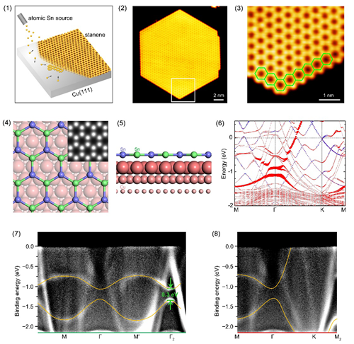 纯平蜂窝结构锡烯的制备和原子尺度形貌图(1-3)、结构模型(4-5)、理论计算(6)和实验观测到的电子能带结构(7-8)。