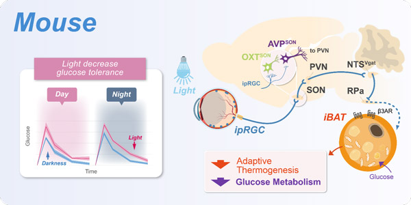 对栖息于这颗蓝色星球上的生命而言,光是一切生命产生的源动力,也是生命体最重要的感知觉输入之一。同时生命体根据外界环境条件控制体内营养物质的代谢平衡是生存的必须,而代谢紊乱会产生严重疾病,哺乳动物已经进化出了精确和复杂的调控网络用于持续动态调控血糖代谢。大量公共卫生调查显示夜间过多光源暴露显著增加肥胖和糖尿病等代谢疾病风险,那么光作为最重要的外部环境因素,其是否直接调控血糖代谢?其中涉及哪类感光的细胞、何种神经环路以及外周靶器官,这些方面的问题一直没有得到解答。