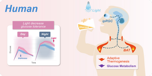 图2:在人上,光可能通过同样的神经环路机制压抑棕色脂肪产热降低血糖耐受性。相较于白天,夜晚人的血糖耐受性更低。