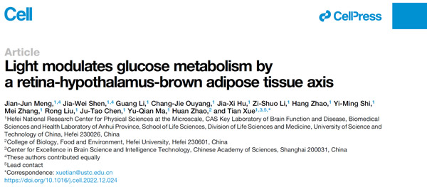 2023年1月20日,中国科学技术大学薛天教授研究团队在Cell在线发表题为Light modulates glucose metabolism by a retina-hypothalamus-brown adipose tissue axis的研究成果。该工作发现了光直接通过激活视网膜上特殊的感光细胞,经视神经至下丘脑和延髓的系列神经核团传递信号,最终通过交感神经作用于外周的棕色脂肪组织,直接压抑了机体的血糖代谢能力。值得指出的是,这项工作不但在小鼠动物模型上系统回答了光调节血糖代谢的生物学机理,在人体试验上也发现了同样的现象,显示光调节血糖代谢可能广泛存在于哺乳动物界。