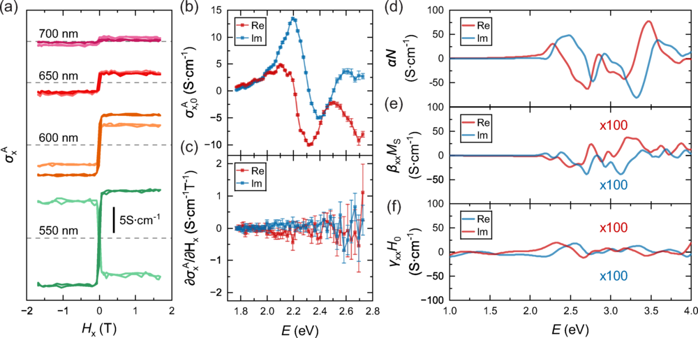 图 2 (a) 赤铁矿1120样品在不同波长下σxA随Hx的变化;浅色曲线为实部,深色曲线为虚部。(b),(c)σxA谱的截距与斜率。(d),(e),(f) 计算得到的Néel序诱导电导率αN,磁化诱导电导率βxxMS和外磁场诱导电导率γxxH0,其中MS=2.13×103 A/m,H0=1 T。