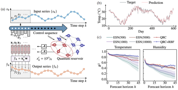 (a)量子储层计算示意图;(b)单步气温预测实验结果;(c)经典网络与量子储层在多步预测中的性能对比