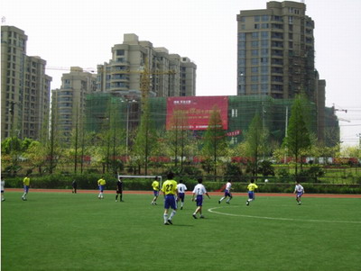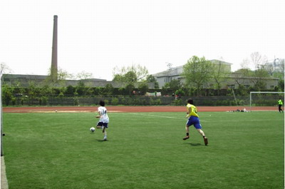 4月3号,我们迎来了第一场小组赛,对手是继续教育学院。可是就在比赛前20分钟,我们的主力中后卫黄波突然打电话告诉队长,中午在食堂吃饭吃坏了肚子不能参加比赛。本已经安排好的阵容突然乱了套,球队里没有人能胜任中后卫这个位置。我们的队长在考虑过后,决定让9号姚宏斌暂时顶替中后卫的位置。面对实力不清楚的对手--继续教育学院队,我们只有先试试这样的安排。比赛刚开始,双方都很谨慎。随着比赛的进行,对手逐渐表现出他们的优势:身体好,身高占优势,有几个球员身高在一米八以上,中场几个球员的意识和技术都不错。他们凭借着身高优势不断向我们的后防施压,在10分钟左右,他们获得了前场任意球。他们开出了一个高球,那些一米八的球员都挤在我方禁区里面,结果我们只有看着球被他们顶进了门网。0:1,对手取得领先。感觉那时的我们很无奈。不过,我们并没有放弃,相反打得更开了,积极地拼抢,传球,打出了几个不错的配合。在20分钟的时候,我方前锋通过自己的拼抢,在前场拿到球,一脚远射,球进。1:1我们追平了比分。一下子,士气大涨,比赛进入了僵持阶段。在30多分钟的时候,对方一个反击,撕破了我们不稳定的后防,又取得了领先。我们开始急躁起来,不断地进行进攻,结果就在上半场比赛结束前,他们又是一次成功的反击,取得了2个球的领先。中场休息,队长作了调整,把9号姚宏斌的位置前推,11号胡安东撤回防守。下半场的比赛,我们一直努力试图追平比分,但是对方的身体素质太好,每次都把我们的球解围。时间一分一秒过去,队员的体力逐渐下降,进攻越来越无力了,而对手的体力还很充沛,结果我们又丢了一球。最后,我们以1:4的结果输掉了这样比赛。整场比赛,大家都尽力了。同时,也暴露出了问题,我们的中后卫缺席,我们的身体和球技不如人家。尽管如此,我们拼搏的精神始终没有减退。图一为第一场比赛的精彩瞬间。