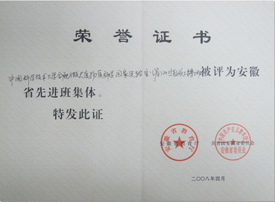 “五四”青年节前夕,共青团安徽省委、安徽省教育厅下文表彰了2008年度安徽省先进班集体,中国科学技术大学合肥微尺度物质科学国家实验室(筹)2005级硕士博士班以其浓厚的学习氛围,积极创新的科研成果,团结奋进的班级凝聚力,青春飞扬朝气蓬勃的班级风采,最终赢得了2008年度“安徽省先进班集体”称号。