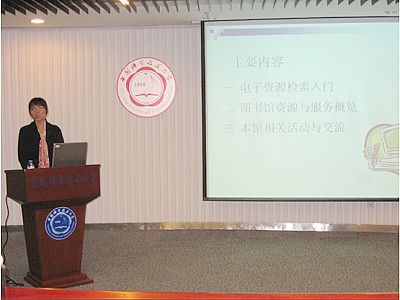 主讲人是图书馆的杜进老师。杜进老师首先介绍了校图书馆的整体状况。如今科大图书馆的网络化以及数字化建设已非常成熟,为读者提供大量的资源。