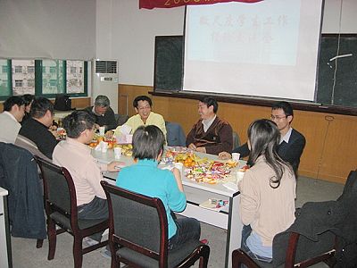 2008年12月26日,合肥微尺度物质科学国家实验室学生工作队伍召开了2009年迎新茶话会。国家实验室党总支书记李凡庆老师,国家实验室主任助理陈旸教授,国家实验室研究生教学管理工作负责人石磊教授,团总支书记庞文民,教学秘书刘燕萍、赵茹,研究生班主任丁延伟、宋策、王成名、王雨松、孙梅等参加了座谈。