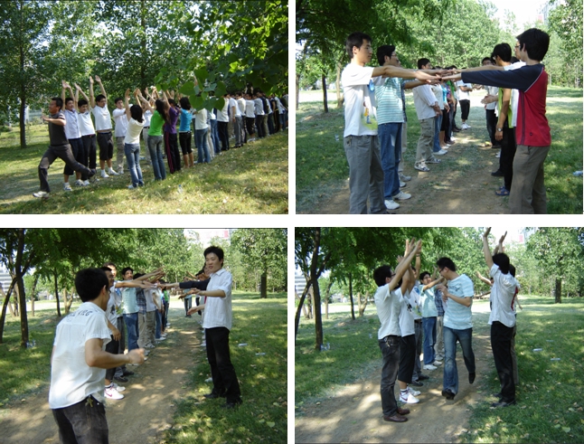 第一个阶段叫做信任快跑。大家通过猜拳胜负分成4列,站成两组。每组成员两两面对,双手平举,构成一个以人为墙,以手为顶的“走廊”。这个环节要求每个人都要从走廊中飞快穿过,不可以犹豫和低头;其他同学需要在该同学接近的一瞬间将手上举以让出通路。这是一个教会我们信任别人的训练,因为穿越的同学必须完全相信“走廊”中的同学一定会在自己冲过去时让出道路。每个人都表现不尽相同,有的同学大吼一声,毫不迟疑地冲过走廊;也有同学捂着脸,小心翼翼地慢跑过去,大家总是用热烈的掌声鼓励这些同学再试一次。