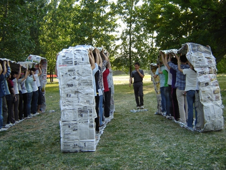 最紧张激烈的莫过于接下来的“车轮滚滚”了。事先准备好的大量旧报纸现在派上了用场,我们必须要用这些报纸和胶带粘成一个巨大的轮子,每组的全部成员要站在这个轮子中向前行进,看哪一组先到达终点。每队只有20分钟准备时间,大家想出了各种粘贴报纸的方法,20分钟结束,考验每组成果的时候到了。裁判一声令下,每个“轮子”都拼命地向前滚,这个过程中轮子有损坏必须停下来修补。“联动青春”队从开始就走错了方向,中途轮子又断了,耽误了很多时间。其他3个队已经到达终点的时候“联动青春”只走了一半。到达终点的同学开始为他们鼓掌加油。最终“联动青春”走完了全程。宋老师说,其实得与失是相对的,最后到达的队伍却获得了最多的掌声。