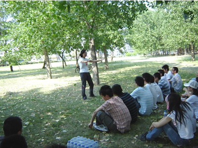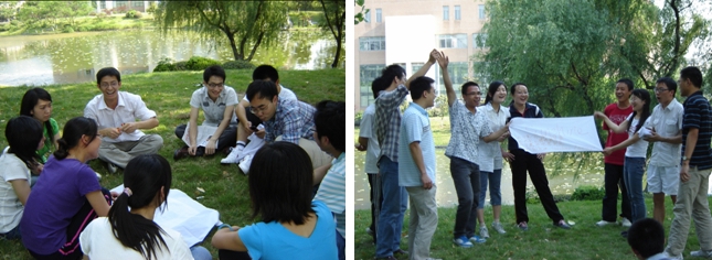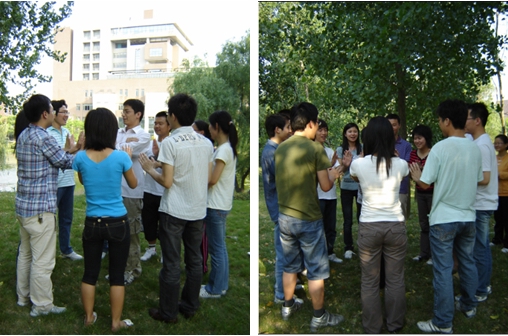 经过了紧张的车轮滚滚,到了放松一下的时候了。所有人围成一圈进行“进化论”游戏。大家从假想自己是一粒“蛋”开始,一路猜拳决胜,胜者逐渐进化为“鸟”、“猩猩”,最后是人类。几分钟之后,场上只剩下几只“猩猩”了。他们互相Pk,终于诞生了一个“人类”。这个环节大家都开怀大笑,完全投入在“进化”的过程中。