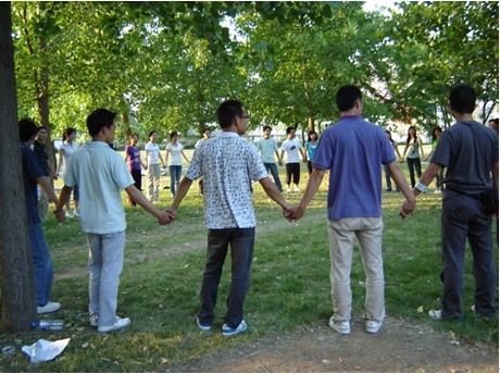 第三阶段也是一个考验信任的游戏“风中劲草”。几个同学围成一圈,站在中间的同学闭上双眼向背后的同学倒去,并被旁边的同学依次传递直到转完一圈。