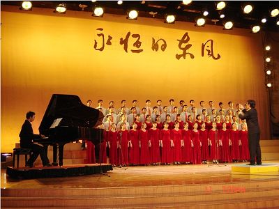 在决赛当晚,由于是第三个上场,合唱队全体同学,顾不上吃晚饭,冒着严寒,穿着统一的服装,经过化妆和练歌之后,登上了决赛的舞台。在决赛舞台上,同学们发挥出色,以嘹亮的歌声和斗志昂扬的精神面貌给各位评委和台下的同学们留下了深刻的印象,演唱结束,全场观众顿时报以雷鸣般的掌声和欢呼声,评委给出了9.718分的好成绩,名列三等奖的第一名。