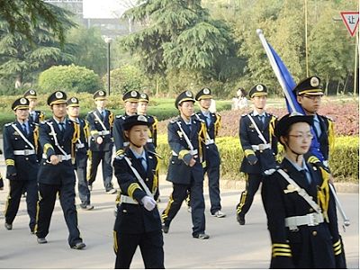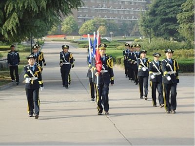 升旗活动于7:20准时开始,升旗人员迈着豪迈而庄重的步伐缓缓地向升旗台走去。