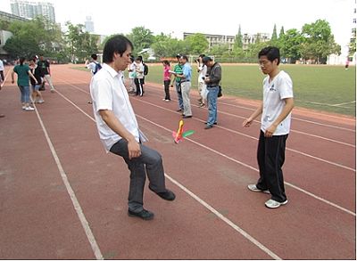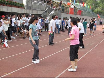 7号下午,运动会整体已接近尾声,但是最有趣的项目才刚刚开始。这就是踢毽子项目。微尺度共有6名运动员参加这项赛事,他(她)们分三组进行,每组一名老师和一名学生。在三分钟的时间内,一组两名运动员相互配合踢的次数领先者胜出。我实验室的李秋花老师和高贵琪同学组合取得了98次的好成绩,以压倒性的优势取得冠军。