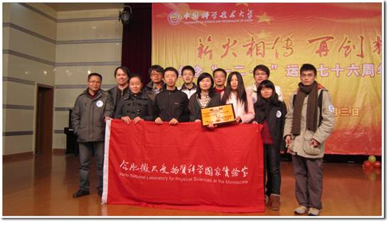 此次文艺汇演,共有来自不同学院、实验室的12个参赛节目参与了评比,最终微尺度国家实验室的诗歌朗诵节目取得了三等奖。全部演出结束后,到场观看演出的微尺度11级研究生班主任周仕明老师、微尺度分团委赵智老师、节目导演11级研究生谢晓同学和参演同学们合影留念。