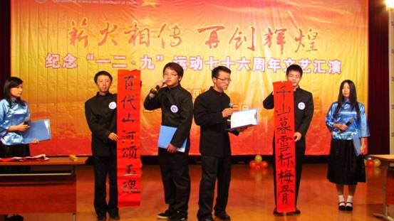 11级研究生张翼博、巩欣、李淑娟和邓家良四位同学的激情朗诵使人们不由自主的追忆起那段波澜壮阔的历史,逐渐沉浸在历史的回忆和反省当中。10级研究生隋聪同学和11级研究生柳青同学挥洒翰墨,写就一副“千山暮雪标梅骨,百代山河颂玉魂”的对联,深切缅怀了那些为新中国的成立抛头颅洒热血的忠魂英烈,使演出气氛达到高潮,场下响起热烈的掌声。微尺度国家实验室的节目演出取得圆满成功。