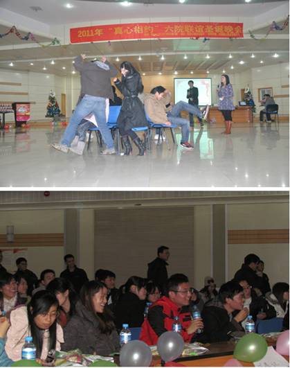 2011年12月23日晚19:00-21:30,“真心相约”六院联谊圣诞晚会在西区活动中心三楼多功能厅顺利举行,此次年末联谊活动由微尺度研究生会牵头,公共事务学院、化学与材料科学学院、人文学院、管理学院以及地空学院等兄弟院系的研究生会同学一起参与了晚会的筹备、启动和现场维持等工作。