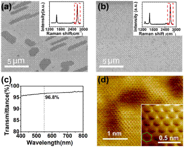 图2. 实验上以两种不同的芳香性分子为碳源在铜箔上低温外延生长高质量的单层石墨烯样品及其表征