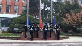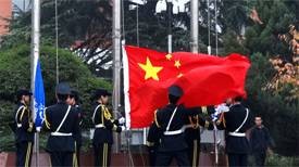 11日一早,同学们身着军装在广场集合,列队完成后,静静地等待那庄严一刻的到来,心中的热情早已驱走了秋日清晨的寒冷。活动正式开始后,由25名微尺度国家实验室2013级研究生、博士生组成的升旗方阵,身穿深蓝色队服,戴着白色手套,迈着整齐有力的步伐,精神饱满地来到升旗台前。在国旗台下,伴着《义勇军进行曲》雄浑嘹亮的国歌声,同学们敬出一个个标准的军礼,鲜艳的五星红旗在郭沫若广场前迎着旭日冉冉升起, 同学们心中的爱国热情也随着国旗缓缓升起;随后,在激昂的校歌声中,中科院院旗和校旗徐徐升起,迎风飘扬。
