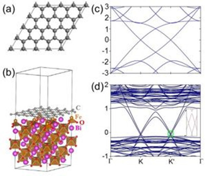 图 1:(a) 4x4的石墨烯超元胞;(b) 4x4的石墨烯超元胞置于铁铋酸的(111)铁磁面上;(c) 对应于图(a)的石墨烯能带图[狄拉克点无能隙];(d) 对应于图(b)的能带图[狄拉克点打开一个量子反常霍尔效应体能隙]。