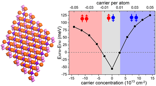 3纳米片是弱反铁磁半导体,而在一定的电子或空穴掺杂下,它转变为铁磁半金属,在费米能级附近具有完全的自旋极化。更为重要的是,电子和空穴掺杂下的载流子自旋极化方向是完全相反的。因此,借助这一体系有望实现电场对载流子自旋取向的直接控制。此外,理论预测该材料的实验工作温度显著高于液氮温度。