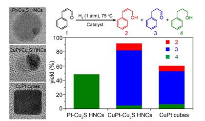 2S可以生成更多的氢化肉桂醛,这一现象表明合金的协同效应对提高催化剂的选择性有着重要作用。该研究通过调控催化剂的空间构型和组分分布实现了对催化剂性能的调控,对设计和开发实用高效的纳米催化剂具有指导意义。