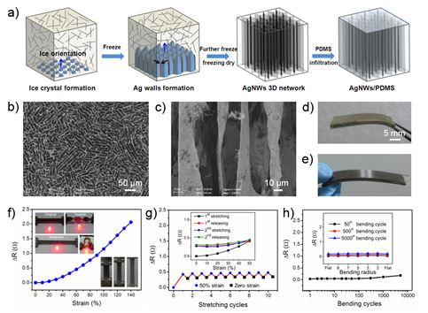 -1,并且在被拉伸、弯曲或扭曲作用后仅表现微小的电阻变化。同时,该银线三维弹性导体在经过上千次的弯曲或拉伸循环后仍能保持良好的导电性能。该研究工作以“Free-standing Macroscopic 3D Hierarchical Architectures Assembled from Silver Nanowires by Ice-templating”为题发表在《德国应用化学》上(Angew. Chem.-Int. Ed. 2014, 53, 4561-4566),并被Materials Views选为研究亮点报道。(