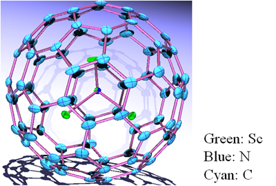 富勒烯结构中最为特殊的性质是其碳笼内部为空腔结构,因此可以在其内部空腔内嵌某些特殊物种(原子、离子或原子簇),由此而形成的富勒烯被称为内嵌富勒烯(endohedral fullerene)。由于内嵌富勒烯内部所内嵌的物种可以转移特定数目的电子到外部的碳笼上,内嵌富勒烯具有许多空心富勒烯所不具备的特殊物理和化学性质,从而成为碳材料领域的国际研究热点。值得一提的是,1999年Nature期刊报道了一种新型内嵌富勒烯 — Sc3N@C80(称之为内嵌金属氮化物原子簇富勒烯),因其产率高于其他所有内嵌富勒烯从而掀起了内嵌富勒烯的研究热潮。随后人们对于基于其他稀土金属的内嵌金属氮化物原子簇富勒烯的研究表明一系列不同大小的碳笼均可以形成内嵌金属氮化物原子簇富勒烯。然而,目前分离出的基于金属钪(Sc)的内嵌金属氮化物原子簇富勒烯的碳笼均小于C80,而仅比Sc3N@C80多两个碳原子的Sc3N@C82虽然被数个研究组发现存在于混合物产物中,但经过分离后却神秘地“消失”了。理论研究结果表明其带隙太小导致动力学上不稳定从而“不可被分离”。因此,实验上能否分离出Sc3N@C82成为十余年来一直困扰着富勒烯界的一大难题。