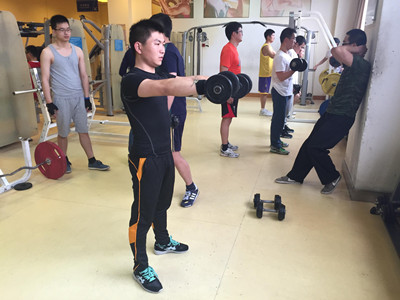在教练的带领下,同学们健身积极性高涨,活动结束后立即投入到健身活动中去。