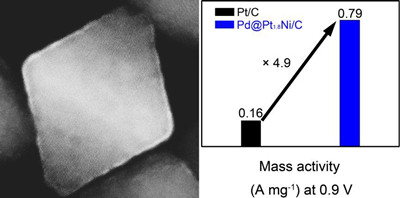 图1. 具有超薄铂镍合金原子层的新型纳米催化剂(左)及其在催化氧还原反应中的铂原子单位质量活性(右)