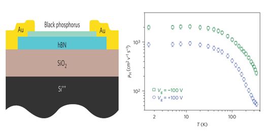 图示:(左)基于薄层黑磷的高迁移率场效应管示意图,(右)空穴(绿)和电子(蓝)霍尔迁移率随温度的变化关系。
