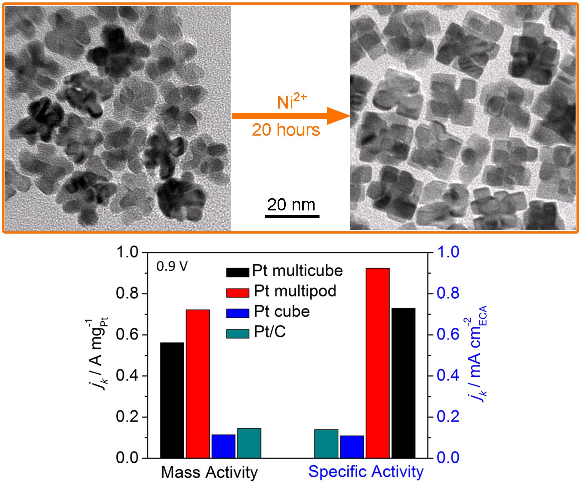 针对该挑战,熊宇杰课题组基于先前发展的具有{311}高指数晶面的铂多足分形结构(ACS Nano 2012, 6, 9797),发展了一种镍离子欠电位沉积的合成路线,实现了从多足分形结构表面的{311}高指数晶面向立方分形结构表面的{100}基础晶面的逐步演变。我校武晓君教授课题组进而通过理论模拟,揭示了镍离子在铂纳米晶体结构转变过程中的表面能调控作用。