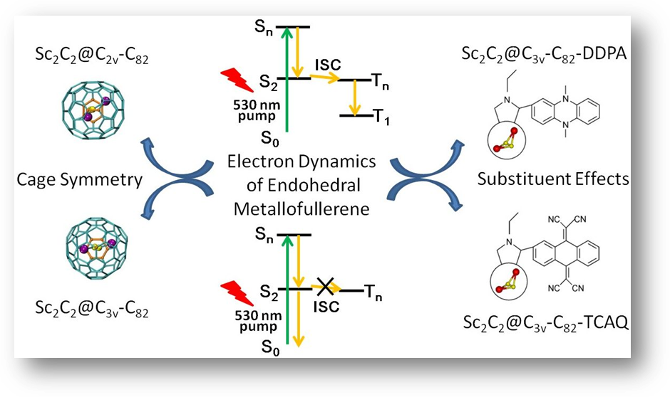 3v)以及相同碳笼对称性而笼外修饰分子基团电子特性不同(电子给/受体)等情形下的可见光激发电子动力学行为。结合第一性原理计算,首次发现了该分子体系中三线态通道的开启与富勒烯碳笼对称性以及笼外修饰分子基团电子特性之间的高度关联性,进而揭示出“光学暗态”在操控其光激发电子动力学演化中的决定性作用。这些研究发现,为基于金属内嵌富勒烯分子体系、面向太阳能可见光利用的光电转换方面的研发工作提供了具有普适意义的机理层面新思路。该工作以“Visible-Light Photoexcited Electron Dynamics of Scandium Endohedral Metallofullerenes: The Cage Symmetry and Substituent Effects”为题发表在《美国化学会志》[J. Am. Chem. Soc. 137, 8769–8774 (2015)]。该论文的共同第一作者为博士生吴波(样品制备/表征)、博士生胡嘉华(超快光谱/动力学)和博士后崔鹏(第一性原理计算)。
