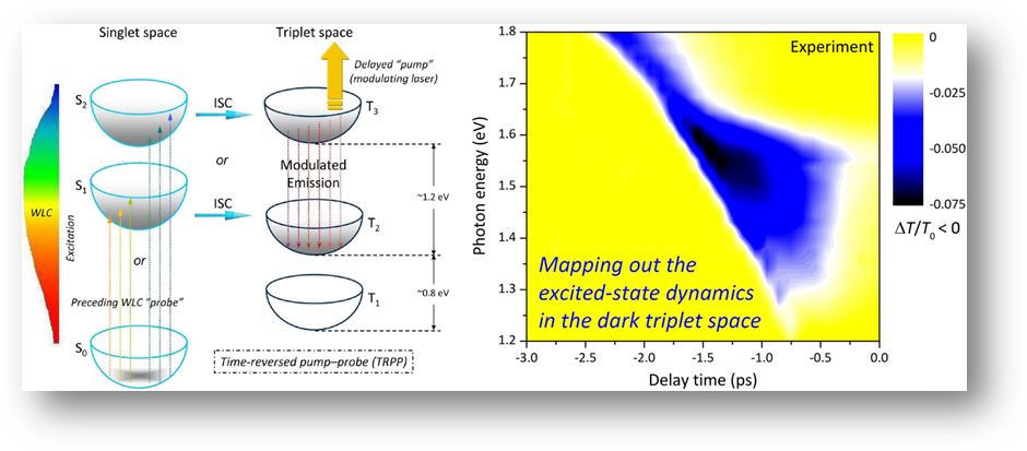 如何有效探测自旋禁戒激发三线态(“光学暗态”)空间的动力学演化,一直是光物理、光化学和光生物研究领域颇为关注的棘手难题。由于存在诸如内转换和分子内振动能量再分布等快速弛豫过程,抽提并刻画发生于“光学暗态”空间的动力学演化十分困难。为此,团队研究人员另辟蹊径,利用高激发的“光学明态”(自旋允许单线态)到“光学暗态”(自旋禁戒三线态)的快速能量转移(系间窜跃),采用一种反常规的“时序反转飞秒泵浦–探测”技术,在模型分子体系(孔雀石绿分子)中实现了对发生在“光学暗态”空间“纯净的”超快动力学演化过程的实时跟踪和刻画。这项非线性光谱技术的发展,为分子发光学、光子学以及量子调控等相关研究打开了一扇新窗。该工作以“Bringing Light into the Dark Triplet Space of Molecular Systems”为题发表在《物理化学·化学物理》[Phys. Chem. Chem. Phys. 17, 13129–13136 (2015)],得到了审稿人的高度评价:“This work presents a novel experimental scheme that may bring new ideas in a topical field of physical chemistry.”、“This is a very interesting and thought-provoking paper. The readers will find the reading stimulating.”。该论文的第一作者为博士生葛晶,并得到研究团队江俊教授课题组在光谱与动力学模拟方面的大力支持。