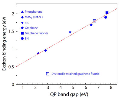 (GW-BSE)方法首先计算了实验上新近发现的两种层状二维材料的激子结合能:黑磷(由我校陈仙辉教授研究组近年首次生长出高质量黑磷单晶)和氟化石墨烯。它们的激子结合能分别是0.85 eV和2.03 eV,再次验证了二维材料由于库仑屏蔽作用的减弱而具有很强的激子效应。更重要的是,他们将这些结果与其它几个有代表性的层状材料体系的激子效应作为整体考虑,发现二维半导体材料的激子结合能与准粒子能隙之间存在显著的线性标度关系,如图所示。利用类氢模型,结合k微扰理论,他们进一步解释了这种线性关系存在的内在物理原因,并用具体例子展示了这一标度关系对确定其它二维体系激子效应的普适性预测功能。