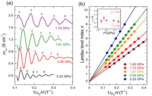图示:(a) 黑磷中压力诱导的半金属态的电导率振荡,(b) 对朗道能级指标的分析表明其中存在拓扑非平庸的振荡相位。