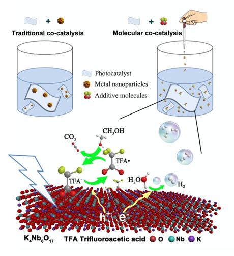 针对上述挑战,吴长征教授研究组毕文团博士和研究生李晓港突破了传统观点认为高效助催化剂大多集中于固相贵金属的局限,首次发现水溶性小分子三氟乙酸(TFA)是一类全新、高效的分子助催化剂。他们创新性地发现TFA存在可逆氧化还原电对,并且在光催化环境中表现出高度的可逆性,这为传递光生载流子提供了新的思路。分子助催化剂TFA通过自身氧化还原电对实现了分子间快速的自由基反应,加速了空穴的快速转移。在铌酸钾二维纳米材料高比表面积优势的基础上,成功将光催化产氢性能提高了32倍。核磁共振、元素分析、原位电子自旋共振等系列表征证实了铌酸钾价带的光生空穴与吸附的TFA阴离子反应能产生高活性的TFA自由基;同时TFA自由基转移空穴至甲醇分子,从而实现铌酸钾二维纳米材料催化体系中电子-空穴对的高效分离。其合作者张群教授研究组研究生张雷采用超快瞬态吸收光谱和稳态/瞬态荧光光谱等测量手段,刻画了该模型体系中与空穴陷阱态和电子陷阱态密切相关的光生载流子动力学行为和机制,从而证实了水溶性小分子助催化剂策略的合理性和有效性。超快动力学分析表明TFA添加后铌酸钾纳米片光生电子的寿命提高了近3倍,揭示出小分子助催化剂诱导的高效空穴转移和电子-空穴对分离是该体系光催化性能大幅提高的根本原因。小分子助催化剂策略的提出,有望摆脱传统贵金属助催化剂体系,为设计廉价、高效的光催化体系开辟新途径。