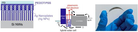 该工作的创新点在于,研究人员基于课题组先前研究的半导体-金属界面上的热载流子注入效应(Angew. Chem. Int. Ed. 2014, 53, 3204;Adv. Mater. 2015, 27, 3444),将具有近红外等离激元吸收带的银纳米片结构引入无机-有机异质结和肖特基型两种光伏器件中,分别取得了近红外光区光电转换性能提高。在近红外光照下,等离激元效应产生的热电子可以直接注入到硅半导体导带中,将该波段中的光电转换量子效率提高了59%。