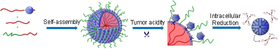 王均教授课题组与聂书明教授课题组利用一个较大尺度的纳米载体(约90 nm)运载多个小尺度纳米载体(约5 nm),并将药物携带在小尺度载体上,形成复合的多级药物输送体系。在其进入血液后,复合结构的纳米载体能够延长药物在血液中的循环时间,并从肿瘤血管中溢出,进入到肿瘤组织。紧接着连接大-小尺度载体的化学键断裂,释放出小尺度载体进一步扩散到整个肿瘤组织,有效地将抗癌药物输送到肿瘤细胞。