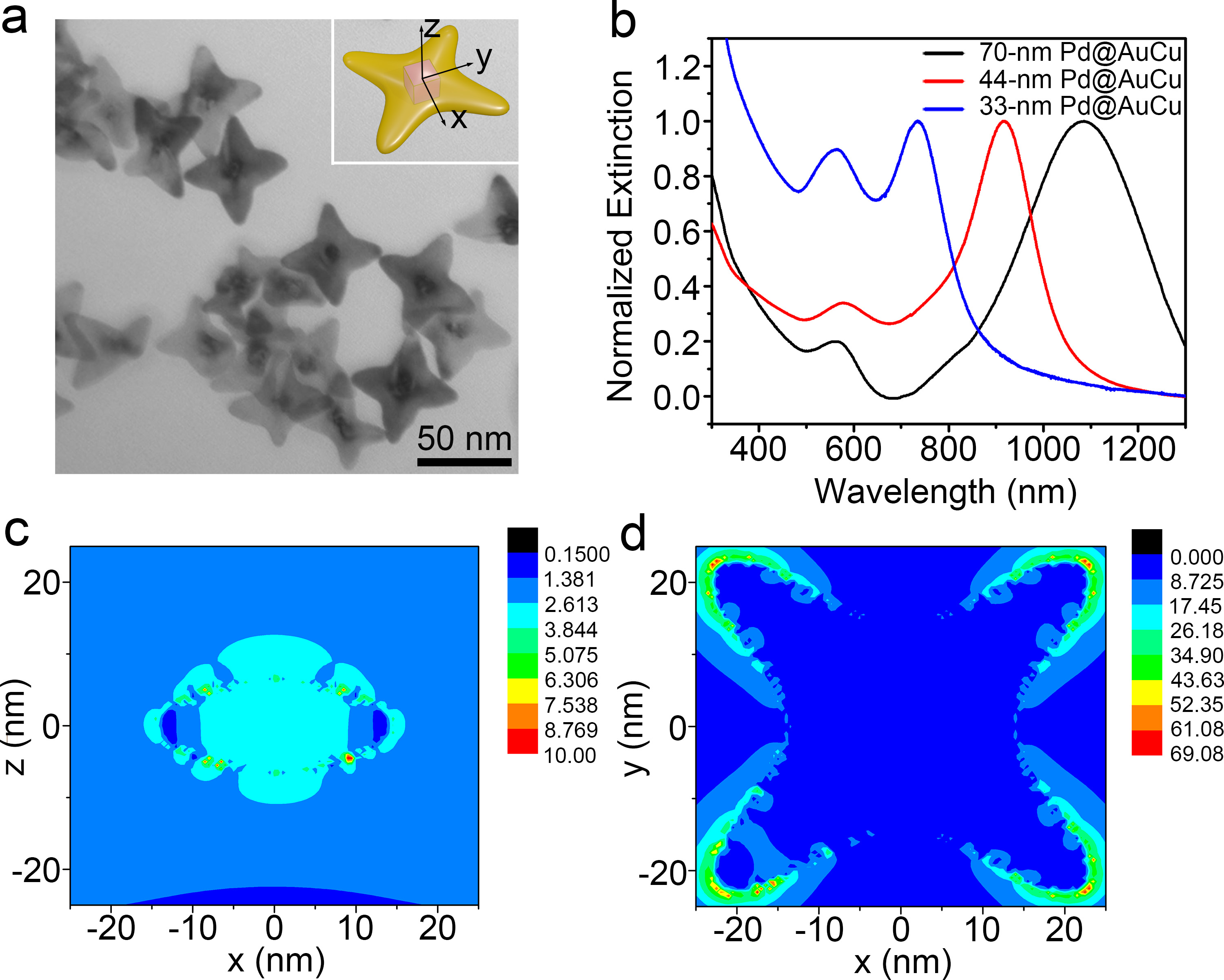 4h对称性的Pd@AuCu核-壳平面四角叉结构。通过调控该纳米晶的尺寸,研究人员能够将其局域表面等离激元面内偶极振动模的位置从可见光区拓展到近红外区。与此同时,该纳米晶的分支特征使其在棱角处的局域电场形成相互耦合的“热点”结构,从而极大的提升了材料的表面增强拉曼散射性能,其中,尺寸为70 nm的平面四角叉结构的增强因子达到近10