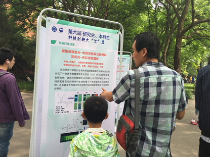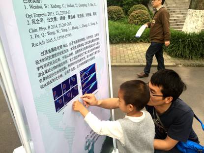 14日早9时左右,陆续有游客进入校园,科技创新大“汇”堂展板所展出的成果很快吸引到了一大批游客,不少家长带着孩子在展板前仔细阅读,而孩子们也拿着由工作人员发放的“点赞”贴纸,为他们喜欢的科研成果“点赞”。