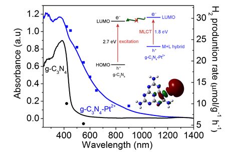 在这种新发展的作用机制中,熊宇杰课题组借鉴了均相配位化合物中金属中心与配体分子之间的电荷转移跃迁过程。该金属-配体电荷转移跃迁可以在低于带间跃迁的能量范围内吸光,从而与带间跃迁形成了互补型的广谱吸光。研究人员将有机半导体二维纳米材料作为大分子配体,利用其中的氮原子位点,引入不到千分之一含量的铂离子或者更为廉价的铜离子,形成了金属-有机半导体的纳米配位结构。该极少量的纳米配位单元诱导产生的电荷转移跃迁过程,使得催化剂产品可以在广谱太阳光范围内进行光催化制氢。国家同步辐射实验室的宋礼教授和朱俊发教授课题组分别利用X射线吸收精细结构谱和光电子能谱解析出了光催化剂的配位结构及能带结构,江俊教授课题组通过理论模拟证实了该电荷转移跃迁作用机制。该技术途径的发展将推动有机半导体材料在光解水制氢方面的应用,也为广谱光催化材料的设计开辟了一条新的思路。