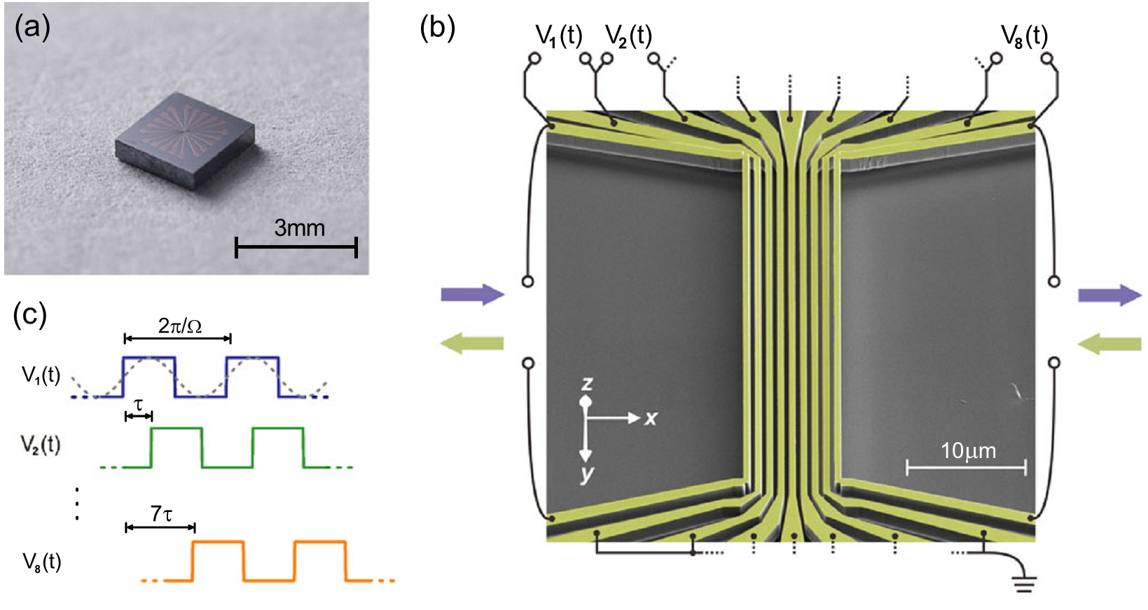 图4:在一块远小于波长数十万倍的硅基芯片上,由纳米力学振子构造出由九个“原子”构成的可编程人工晶格。