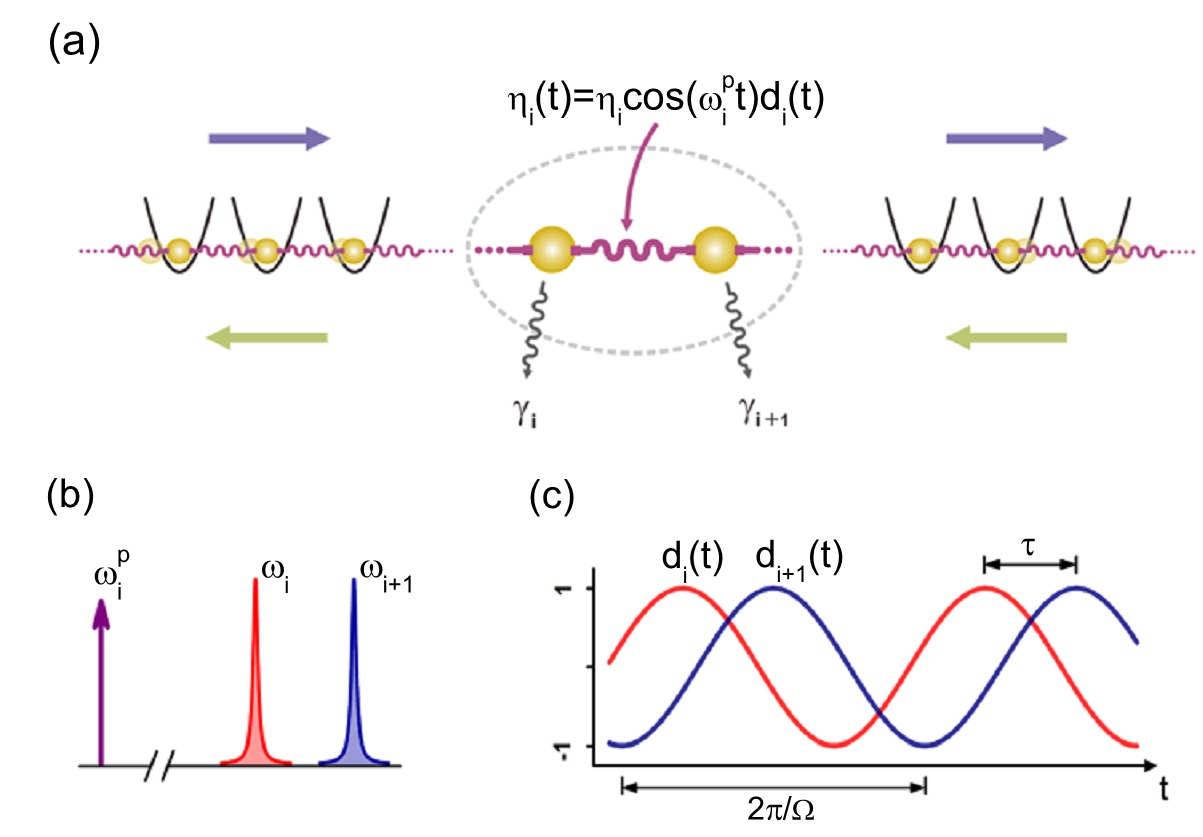 图3:一维人工晶体,和传统的晶体不同,人工晶体中的“原子”之间可以产生任意含时的相互作用,从而能够破坏时间反演对称性。