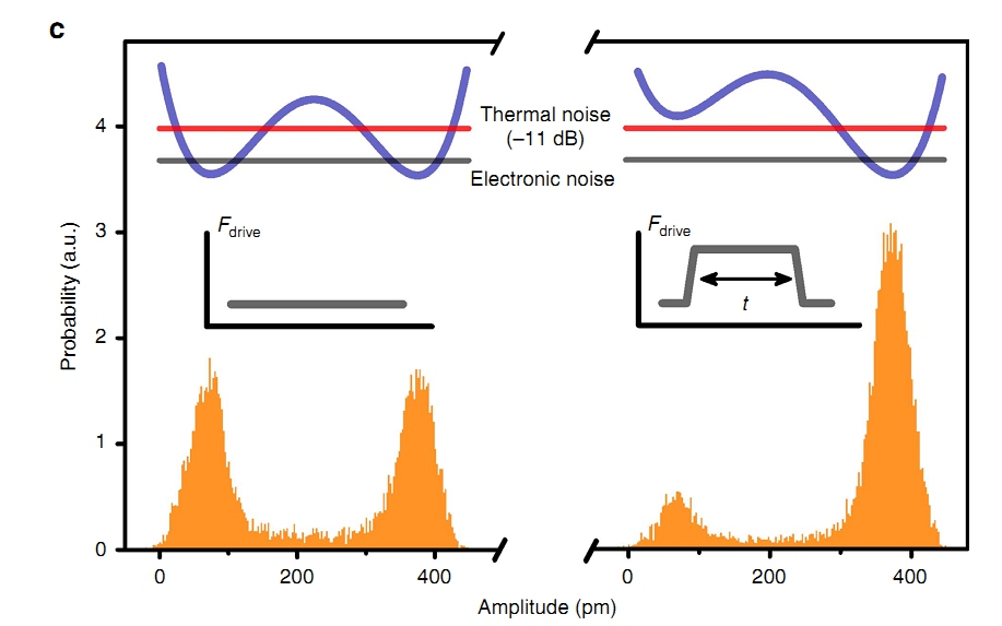 科大研究人员另辟蹊径,首次提出了通过单个化学键与纳米机械耦合产生非线性的新方法(图1),并在实验上加以实现,其非线性响应强度比之前报道的最高指标高出一万倍,而且可大范围精确调节。在此基础上,研究人员首次观测到有微弱布朗运动引起的双稳态动力学(图2),标志着纳米力学系统首次达到热非线性区。该工作被审稿人认为是 “使用灵巧的设计解决了困扰该领域研究多年的核心问题(the authors introduce an ingenious alternative to resolve this outstanding problem)”,“这一突破性的工作将开创基于同步过程的精密测量和信号调控、量子物理基本问题等研究的新方向(This groundbreaking work may open new directions for synchronisation-based sensors, signal-processing devices, and fundamental studies of quantum physics.)”。此外超强非线性的产生对开展基于纳米力学的宏观量子效应的研究,以及实现诸如高频引力波等极微弱力学信号的测量,都有着重要的意义。该工作发表在5月26号的《自然-通讯》(Nat. Commun. 7:11517 (2016))上。