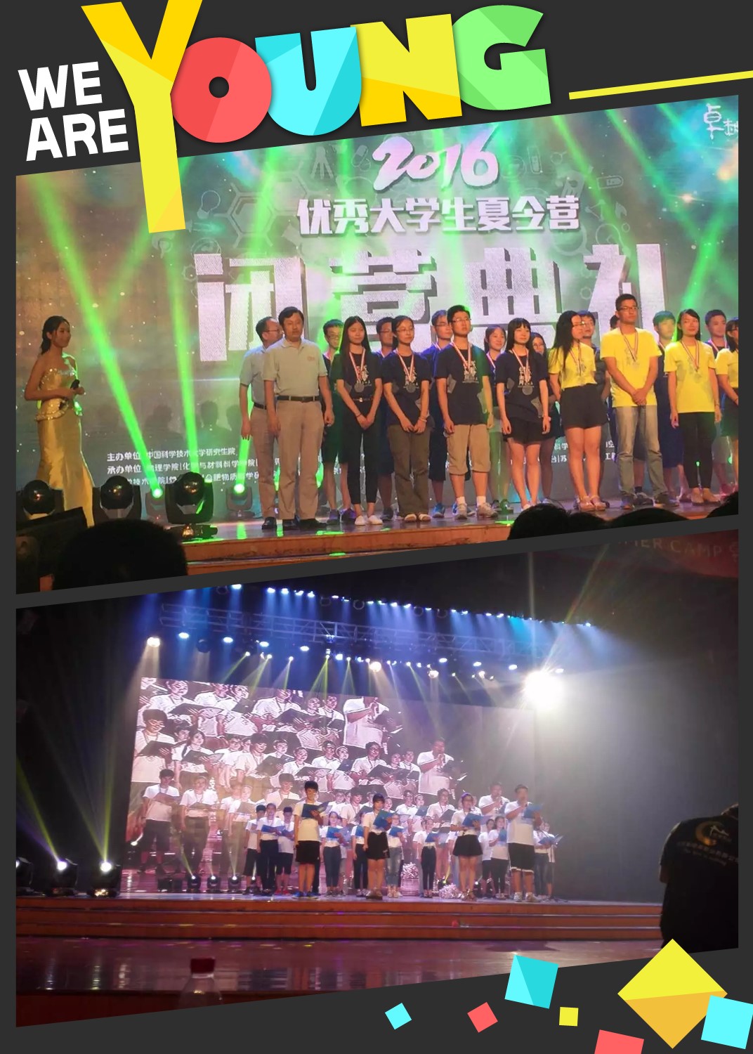 7月22日晚,随着2016年中国科大优秀大学生夏令营闭营晚会在东区礼堂落下帷幕,2016年的夏令营就圆满结束了。闭营晚会的节目来自每一位营员和志愿者的共同努力,对优秀营员的表彰也是对大家的一份肯定。就像晚会节目的最后,我们大家不说再见,相约来年在科大再相见!