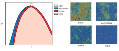 在二维体系中,横向涨落随着系统增大而对数增长,从而导致二维晶体结构的破坏,因此,二维体系在热力学极限下不存在严格意义上的晶体,二维固体的熔化也会相应地呈现出与三维固体的差异。上世纪70年代,Kosterliz、Thouless、Halperin、Nelson和Young发展了KTHNY理论来描述二维固体的熔化。根据该理论,二维固体在熔化过程中会出现一个中间态:六角相(hexatic phase),因此,二维固体熔化是个两步过程,固体到六角相和六角相到液体的相变都是连续相变,分别对应着位错对和旋错对的分解。随后的大量实验和模拟工作都证实了六角相的存在和二维固体的两步熔化,但是,近期的一些研究表明,六角相到液体的相变并不完全像KTHNY理论预言的那样是连续相变。例如,刚性粒子呈现的是一级相变,随着粒子变软,会出现由一级相变到连续相变的转变。二维固体的熔化由于其复杂性,一直是软凝聚态物理领域研究的一项热门内容。