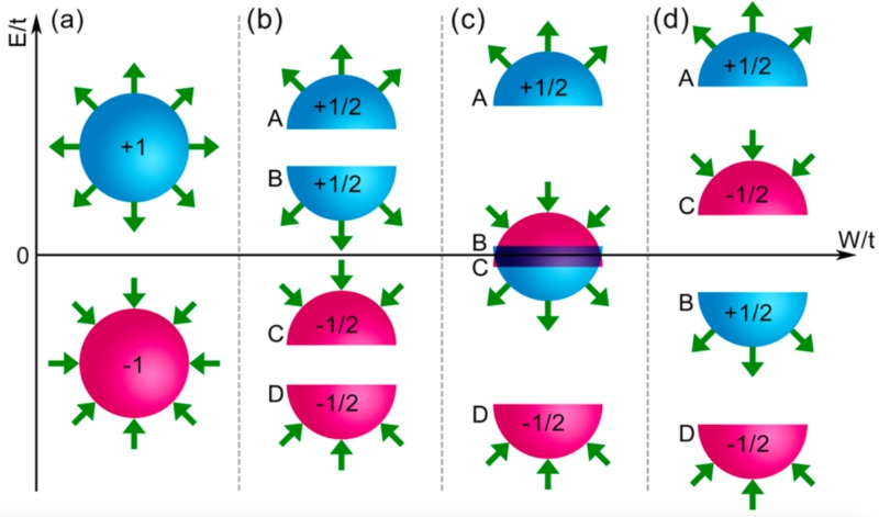 图一:量子反常霍尔效应随着杂质强度变大逐渐从整数量子化到Anderson局域化的Skyrmion和Meron示意图。随着杂质强度增强,携带整数拓扑电荷(Skyrmion)的价带和导带劈裂成四个携带半整数拓扑电荷的Meron A-D;杂质强度超过临界值后,携带相反拓扑电荷的B/C Meron发生交换,从而使得能隙以下的总拓扑电荷(即总贝利曲率)为零,体系能够变成Anderson绝缘体。
